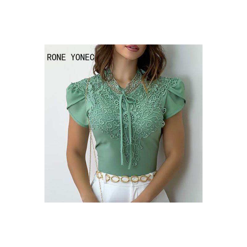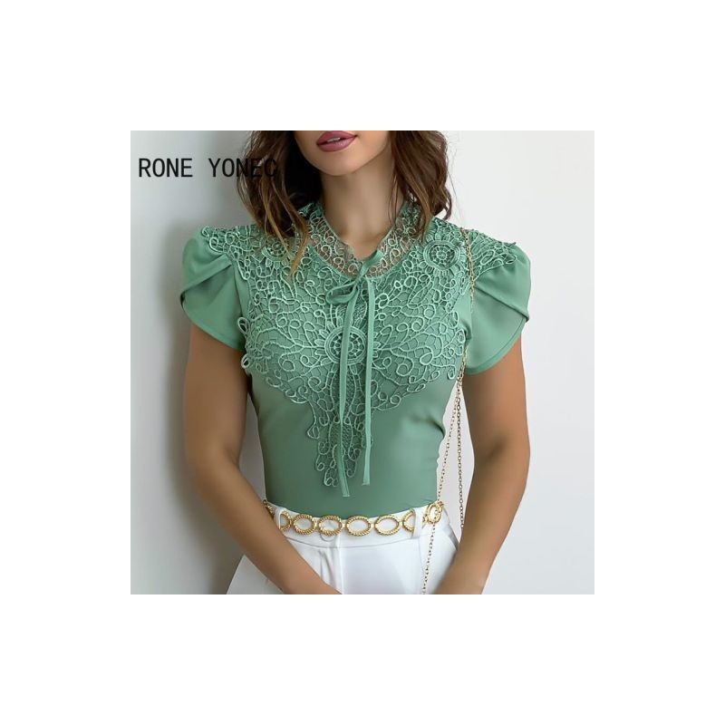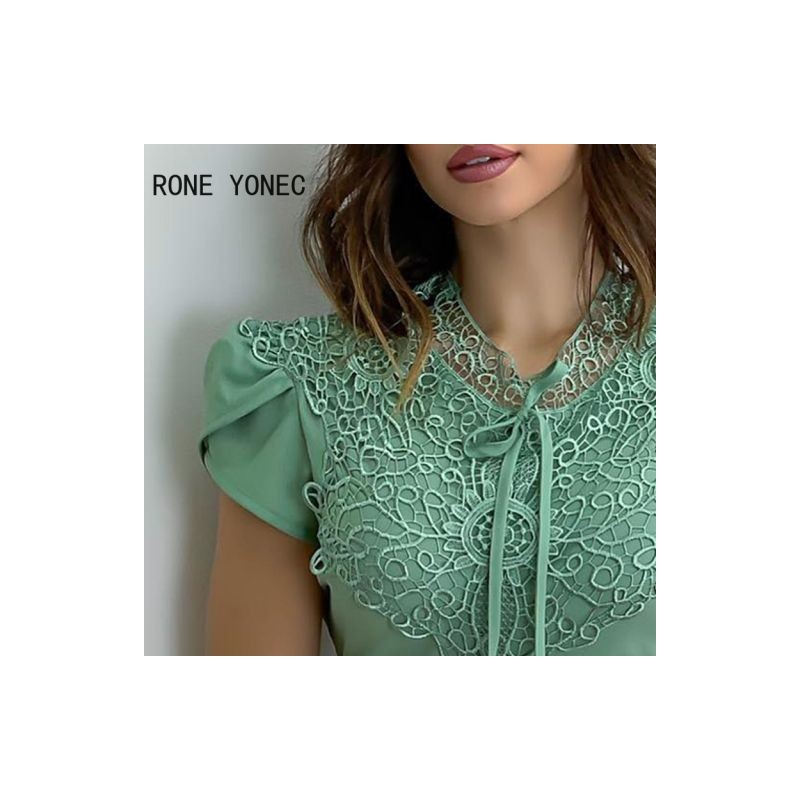 Női elegáns, tömör, kerek nyakú fűzős, rövid ujjú csipke patchwork Bodycon szexi blúz felsők