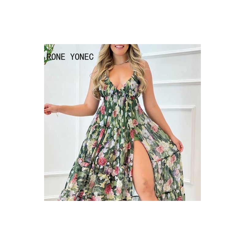 Women Elegant Spaghetti Straps Backless Deep V Neck Sexy All Over Print Maxi Summer Beach Vacation Dresses