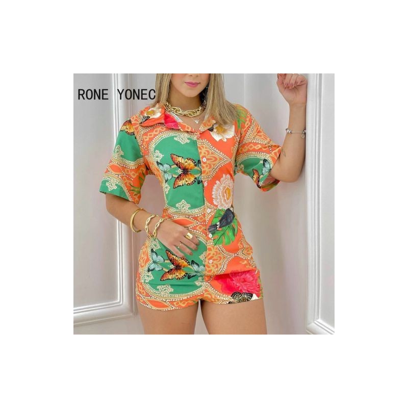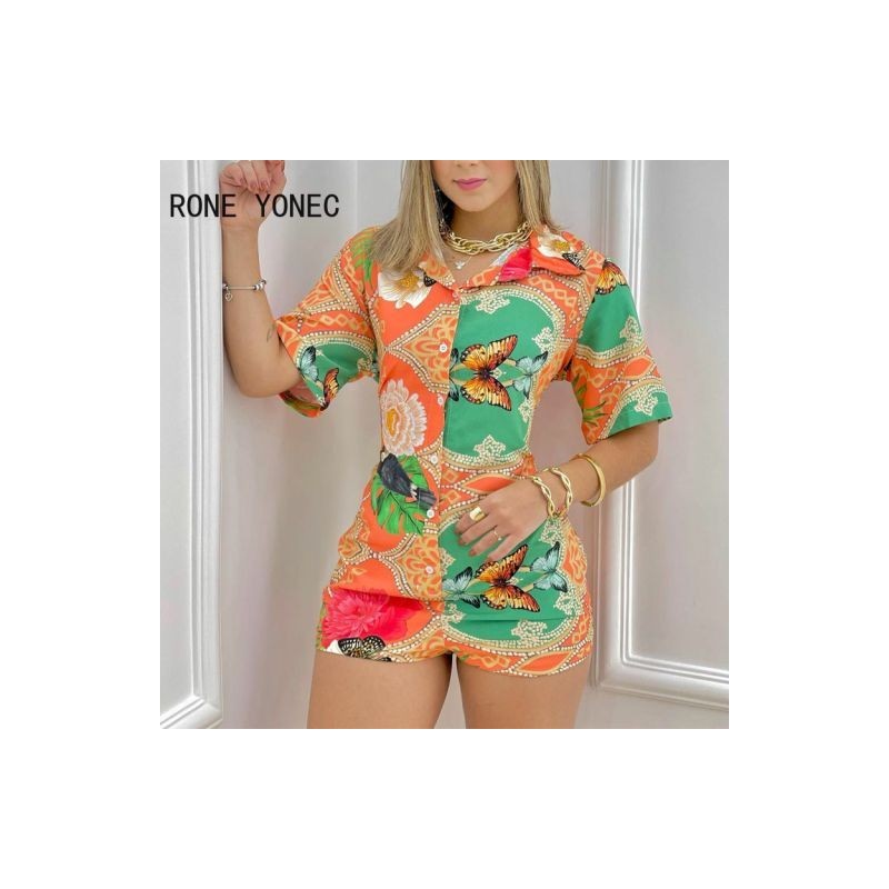 Women Casual shirt Collar Butterfly Pattern Graphic Short Sleeves button Sweet Rompers