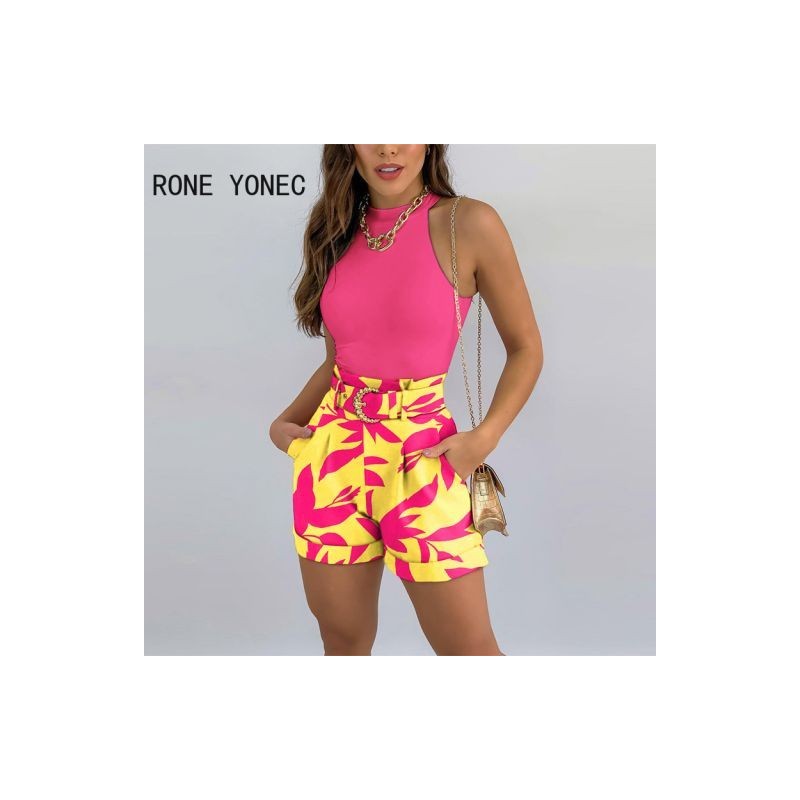 Women Casual Halter All Over Print Bottom & Solid Top Sleeveless Sashes Summer Bodycon Short Sets
