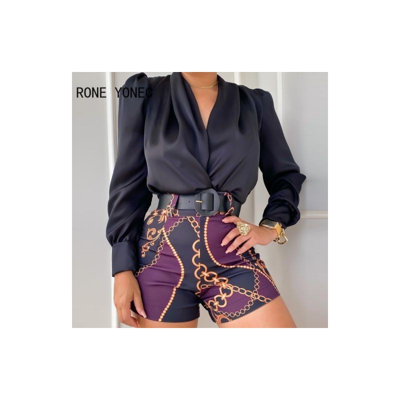 Women Casual Wrap Deep V Neck Sexy Solid Top&All Over Print Bottom with Belt Short Sets