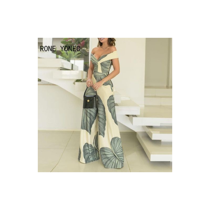 Women Elegant Plant Pattern Off Shoulder V Neck Formal Wide Leg Working Jumpsuits