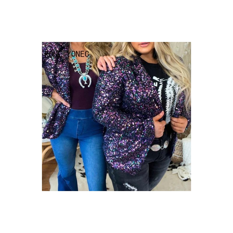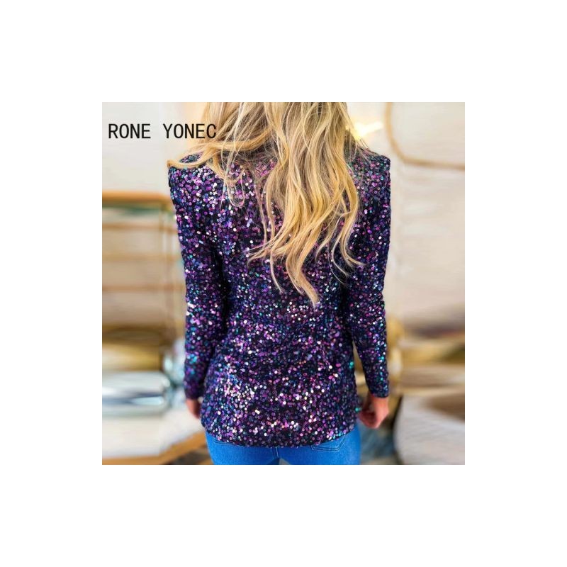 Női elegáns, rovátkolt gallérral nyitott varrás flitterekkel, hosszú ujjú szexi klubblézer dzsekik