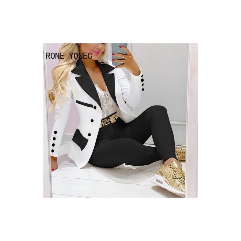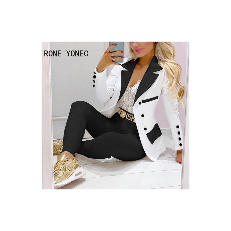 Női dolgozó elegáns, hosszú ujjú, gombos szárnyak patchwork hornyolt gallér tavaszi/őszi vádliig érő nadrág blézer szettek