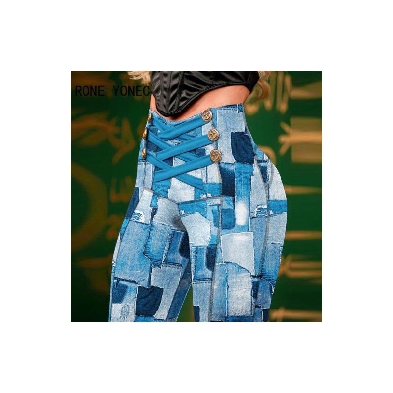 Női elegáns, magas derekú gombos Criss Cross Allover patchwork mintás vékony tavaszi és őszi ceruzanadrág