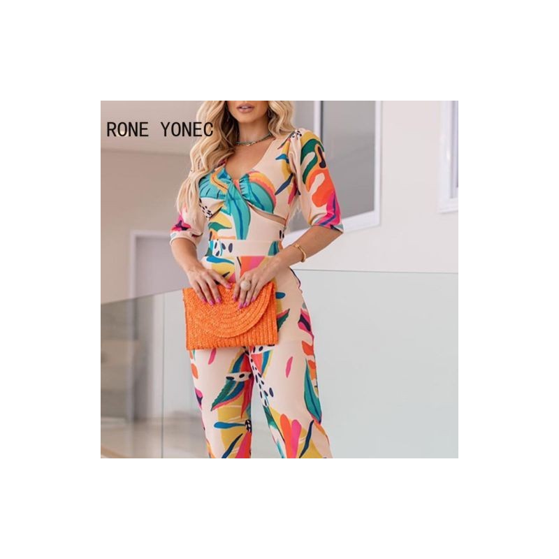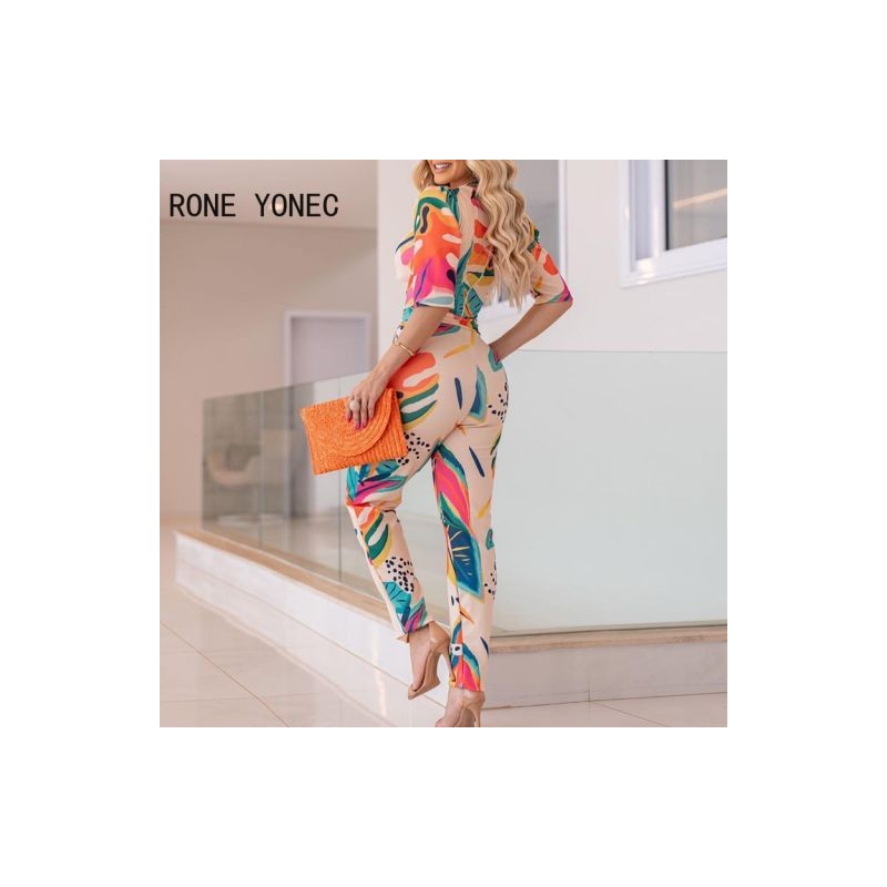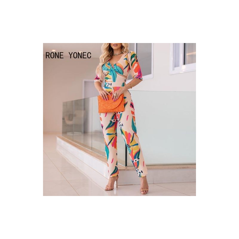 Női elegáns, mindenhol nyomtatott, rövid ujjú, V nyakú, üreges ceruzanadrág-szett