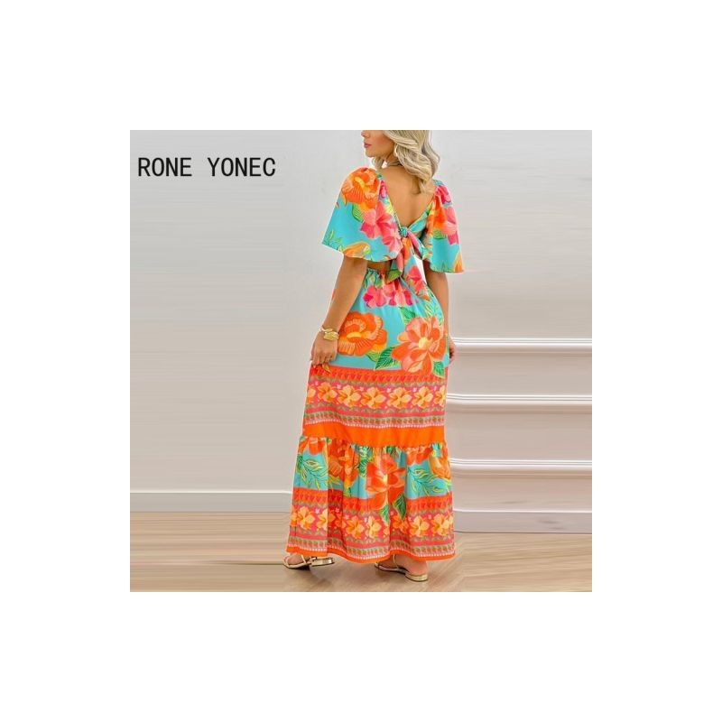 Women Chic All Over Floral Print Lace Up Ruffle Hem Short Sleeves Maxi Dress