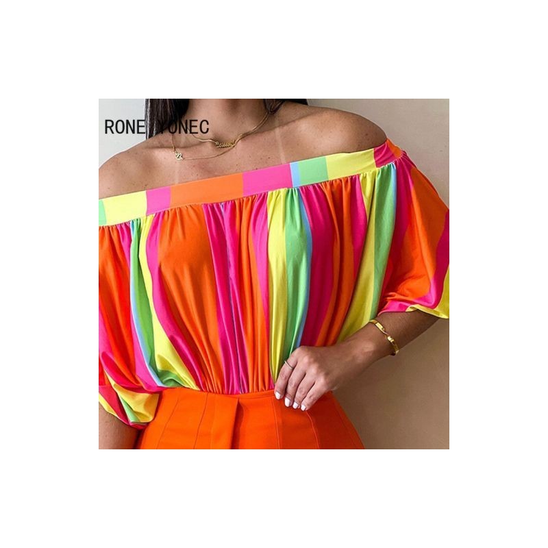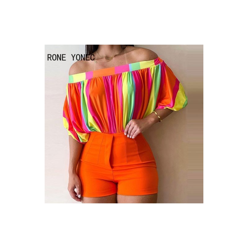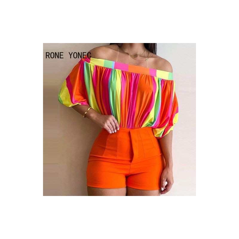 Női slash gallérral denevérszárnyú ujjak, mindenhol nyomtatott Crop felsők és tömör alsó szexi rövid szettek