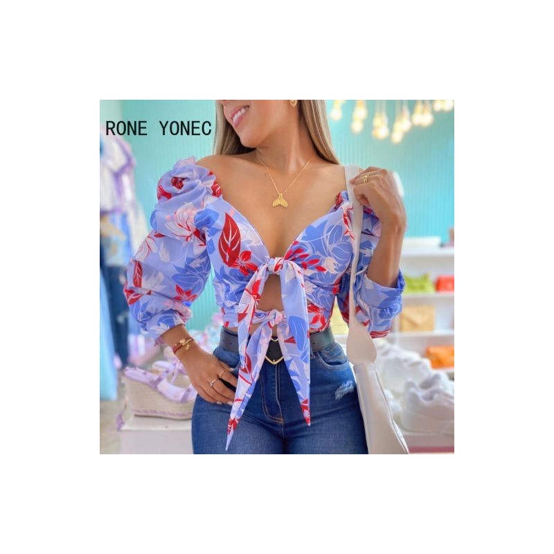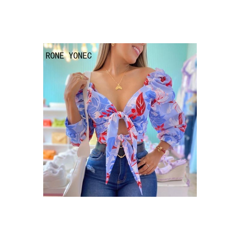 Női Szexi Allover Print Hollow Out Lace Up Off Vállal Lámpás ujjak Blúz Crop Top