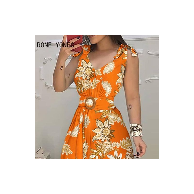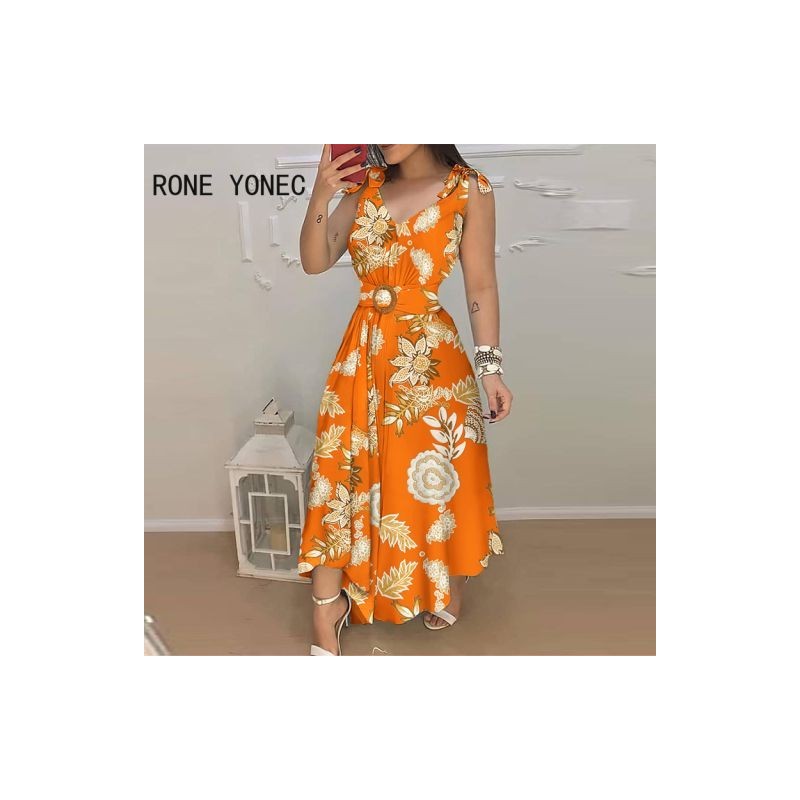 Women Chic All Over Print with Floral Pattern Lace Up Sashes Sleeveless A-line Maxi Asymmetrical Dress