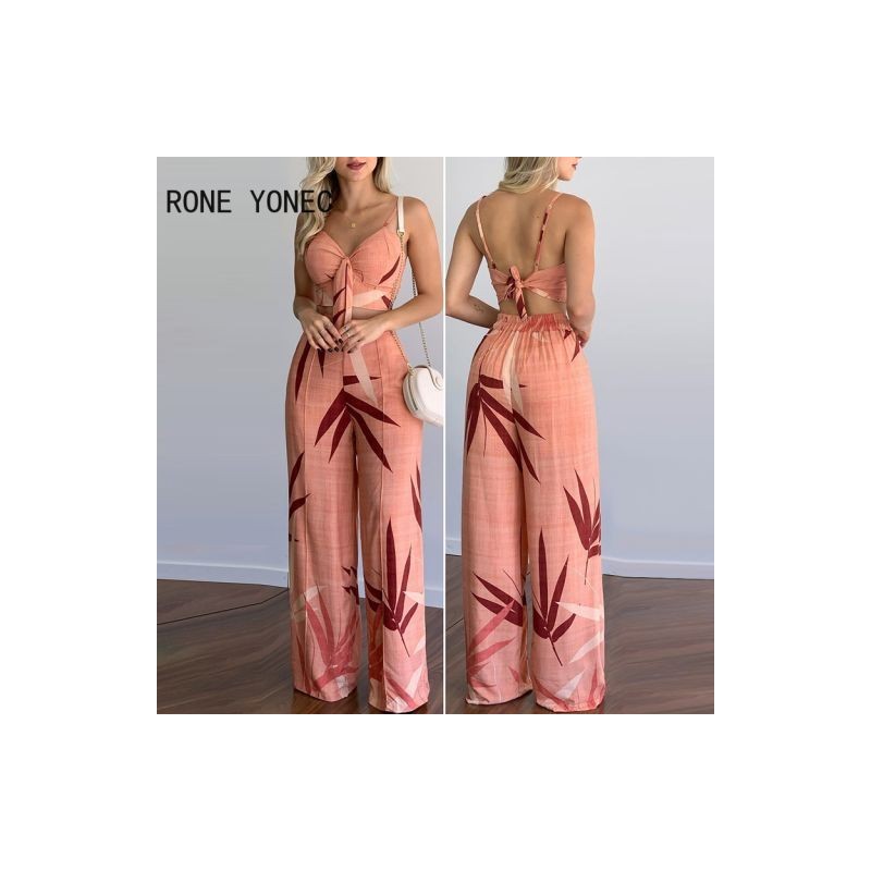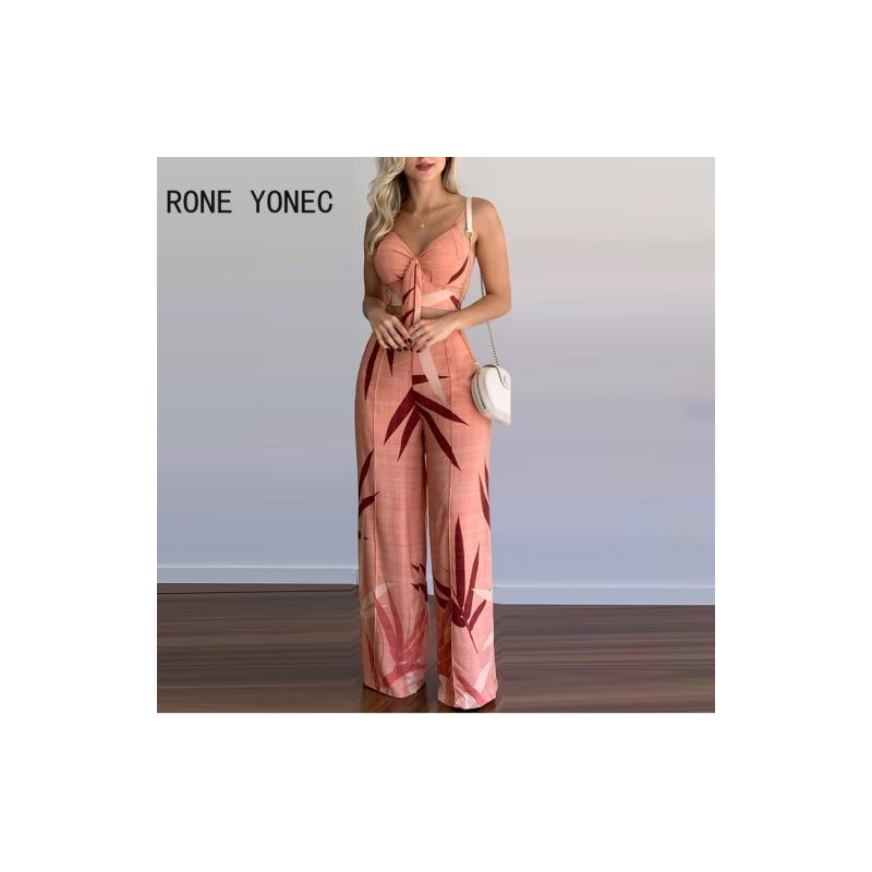Elegáns női spagettipántos, mély V nyakú, vágott felső, mindenhol nyomtatott hosszú, egyenes szexi nadrágszettek