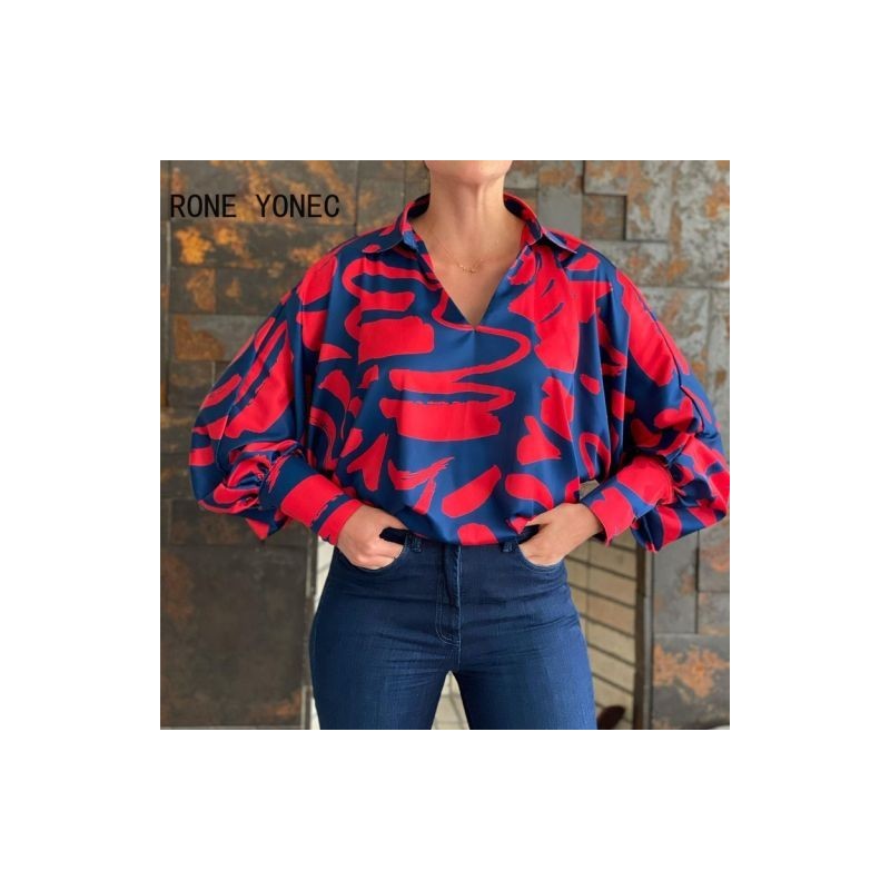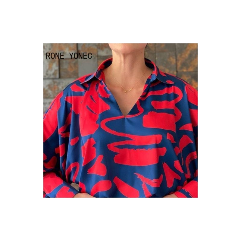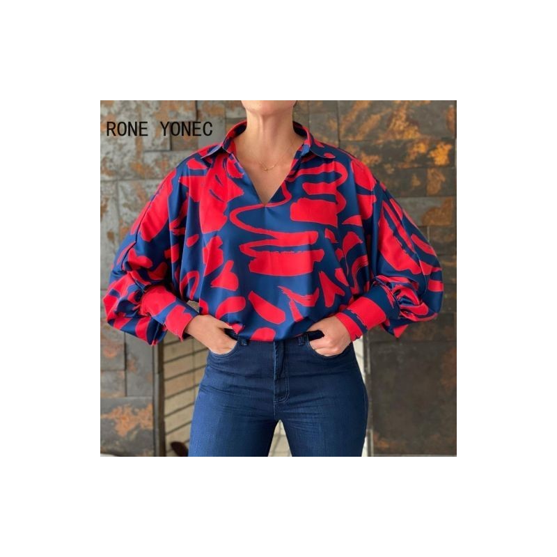 Női alkalmi absztrakt V nyakú, denevérszárnyú ujjú tavaszi bő blúz felsők