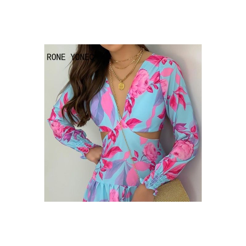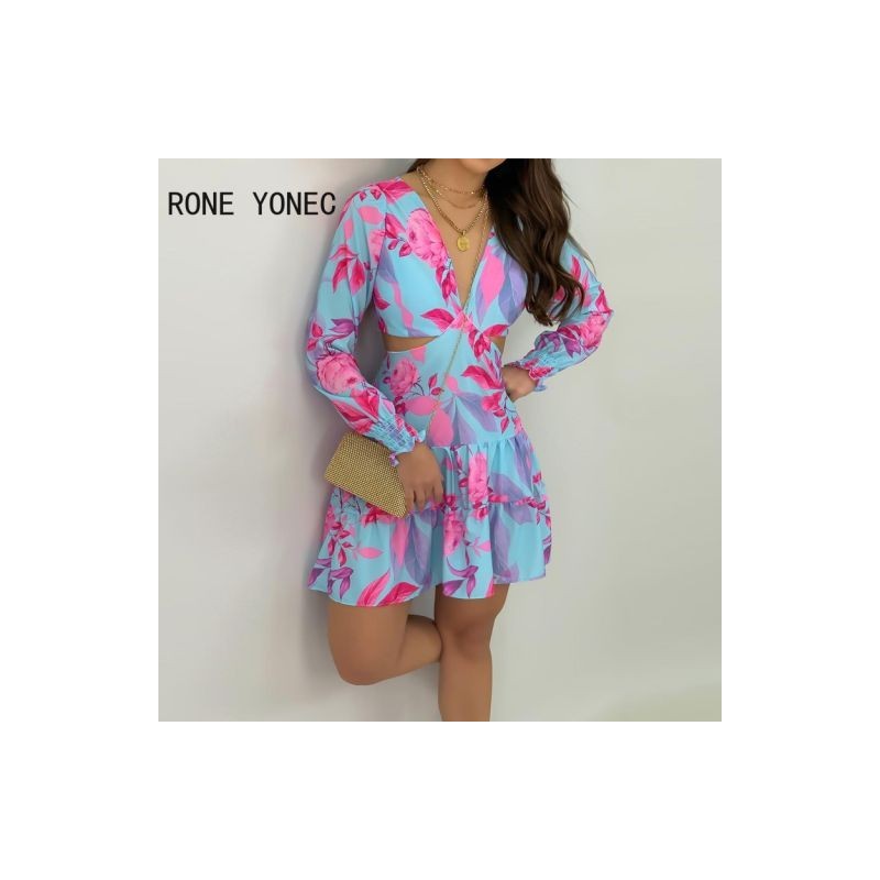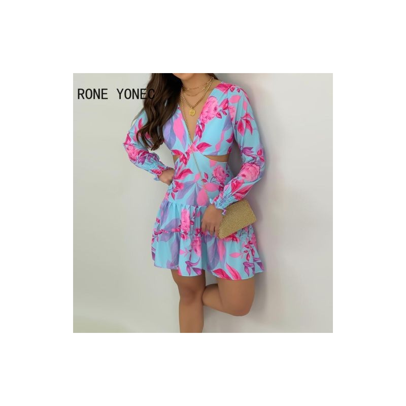 Női alkalmi, mély V nyakú, hosszú ujjú, mindenhol nyomtatott, virágos középső mini szexi vakációs ruha