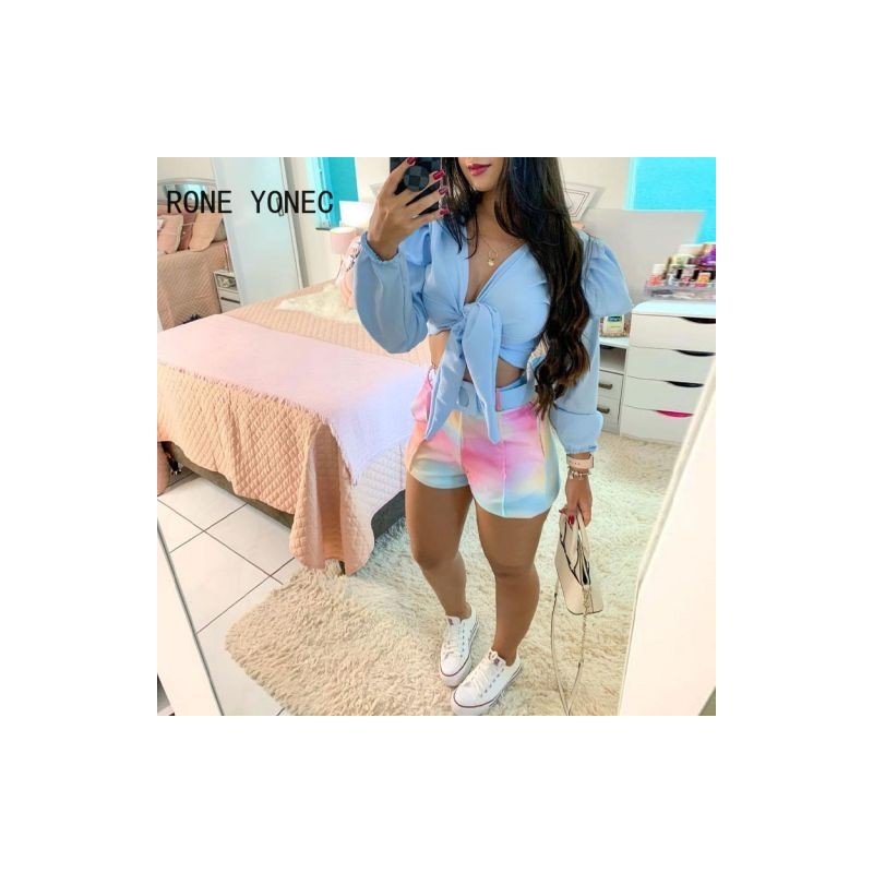 Women Casual Deep V Neck Solid Tops Long Flying Sleeves Sashes Sexy Short Sets with Belt