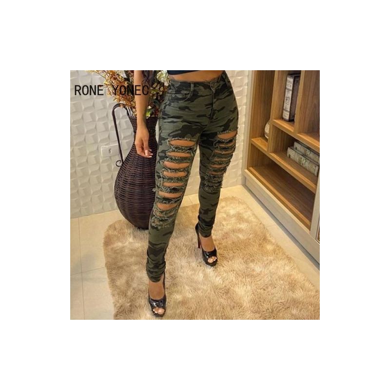 Női alkalmi terepszínű mintás rojtszegély kivágásos farmer Női nadrág
