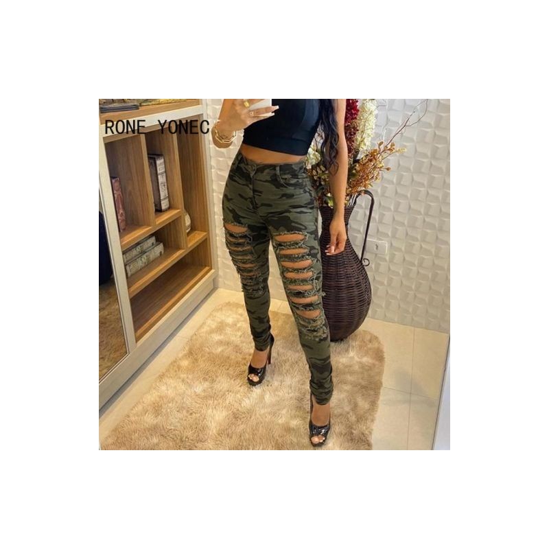 Women Casual Camouflage Print Fringe Hem Cutout Jeans Women Pants