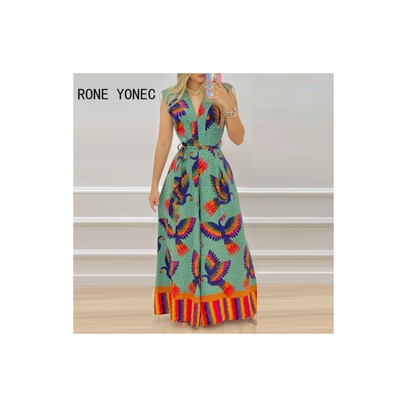 Women Elegant All Over Print Tank Deep V Neck Lace Up Sashes Sexy Maxi Summer Dresses