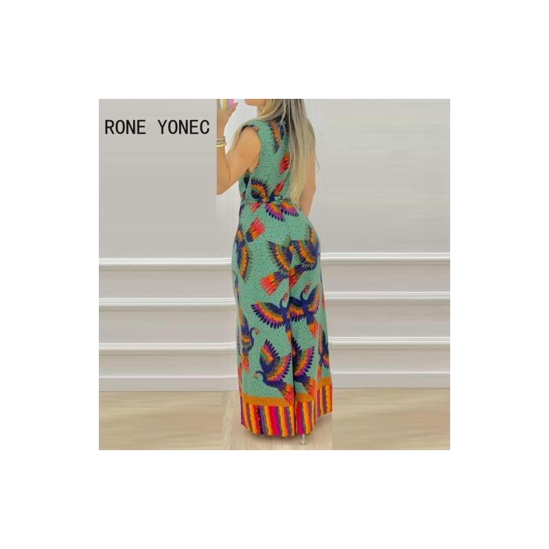 Női Elegáns All Over Print Tank Mély V nyakú fűzős szárnyak Szexi Maxi nyári ruhák