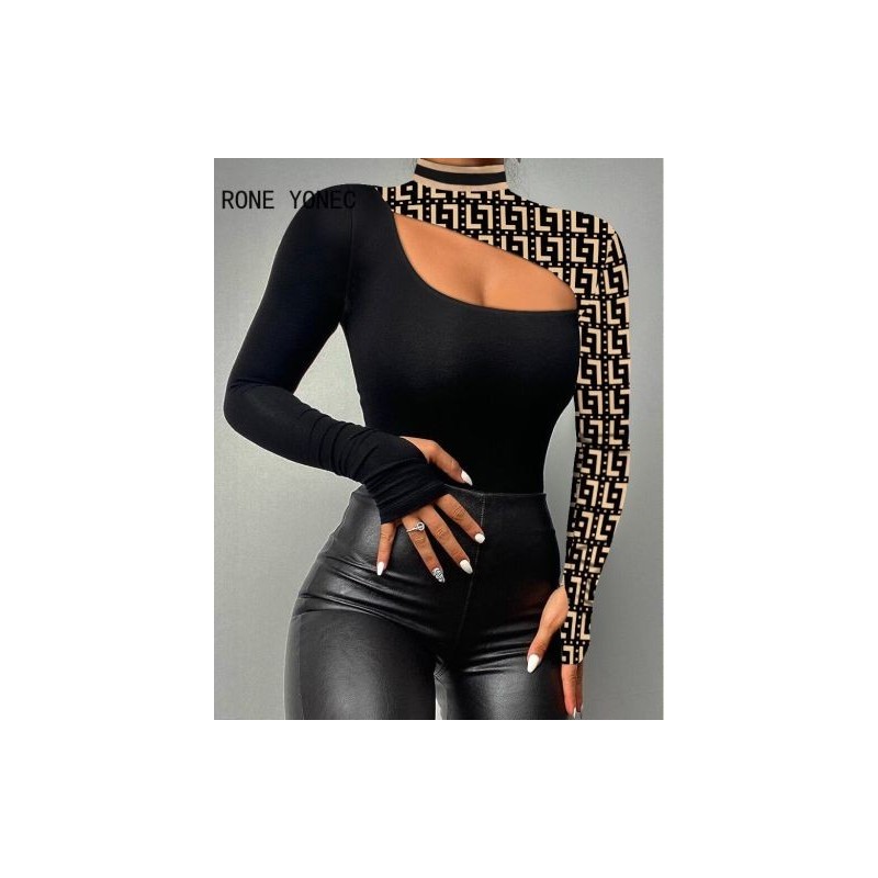 Női elegáns patchwork hollow Out, félig magas nyakú, hosszú ujjú Bodycon szexi fekete blúz felsők