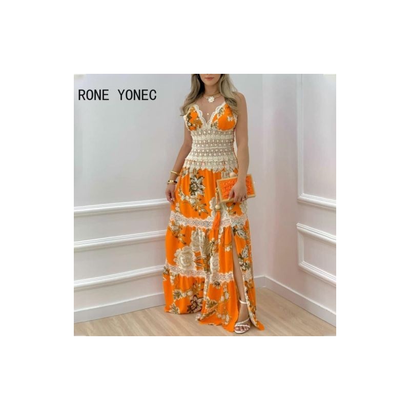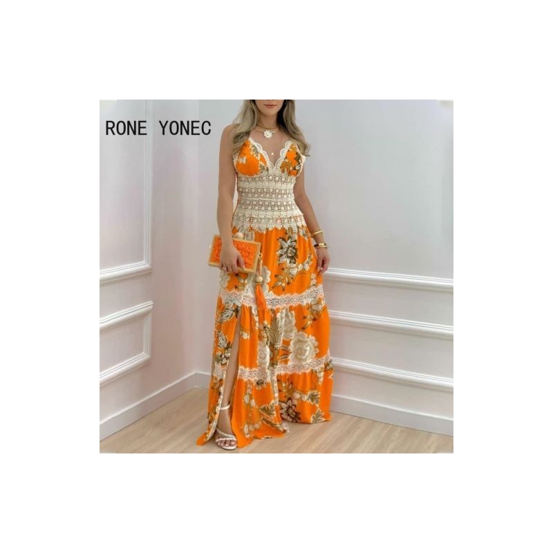 Women Floral Print Contrast Lace Split Hem Maxi Dress Vacation Dresses