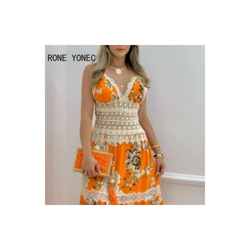 Női virágmintás kontrasztos csipke szegélyű maxiruha vakációs ruhák
