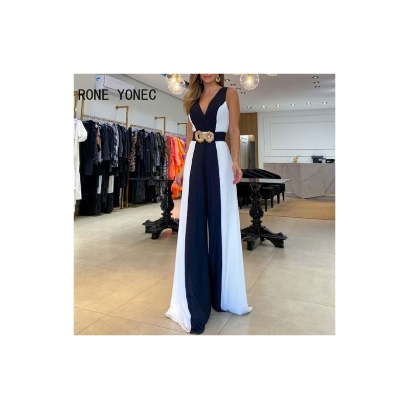 Women Elegant Sexy Deep V Neck Tank with Belt Patchwork Working Jumpsuit