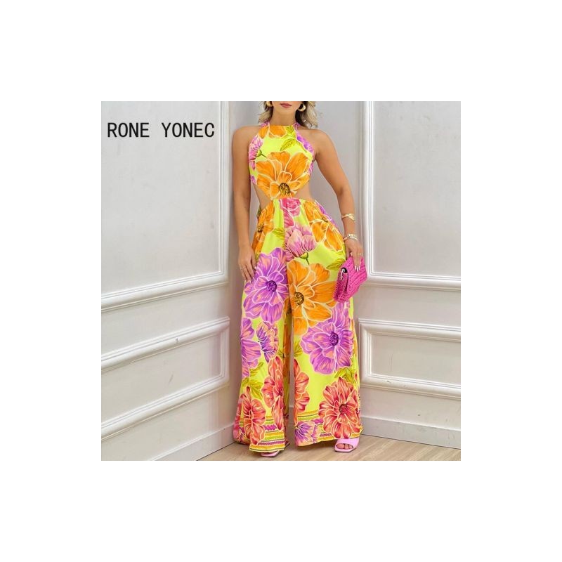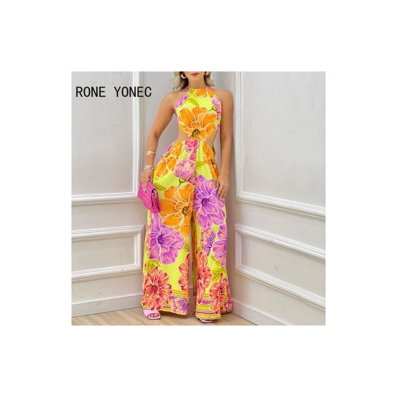 Women Elegant Floral Priint Halter Lace Up Sleeveless Backless Midriff Staight Vacation Jumpsuits