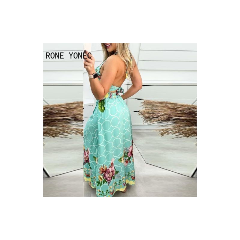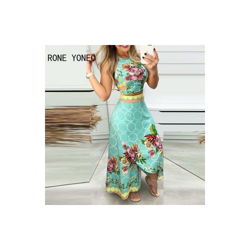 Women Casual Floral Print Halter Lace Up Crop Tops High Silt Skirt Maxi Vacation Skirt Sets