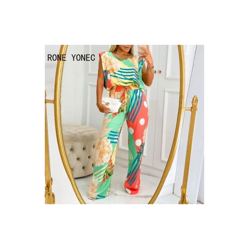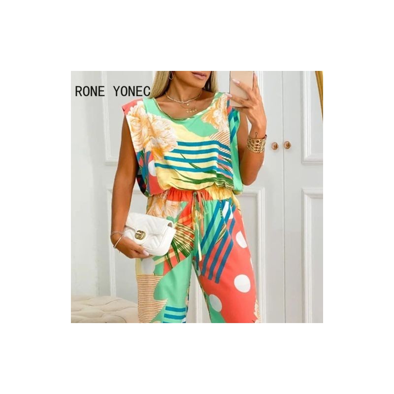 Női All Over Print Ujjatlan, rugalmas derék húzózsinóros alkalmi nadrág szettek