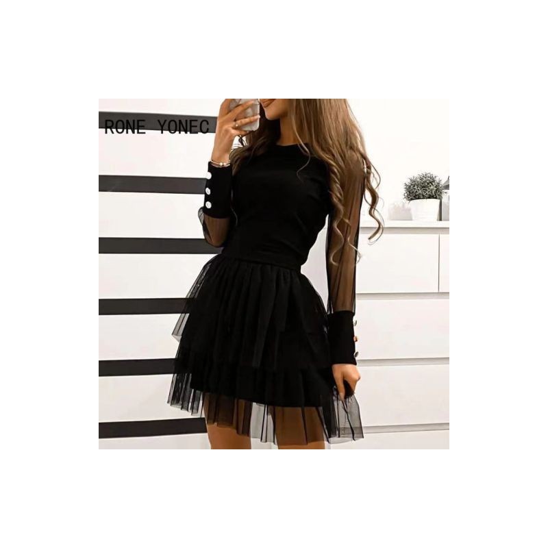 Női elegáns, csillogó kontrasztos hálós, kerek nyakú, A-vonalú, gombdekorációs alkalmi ruha