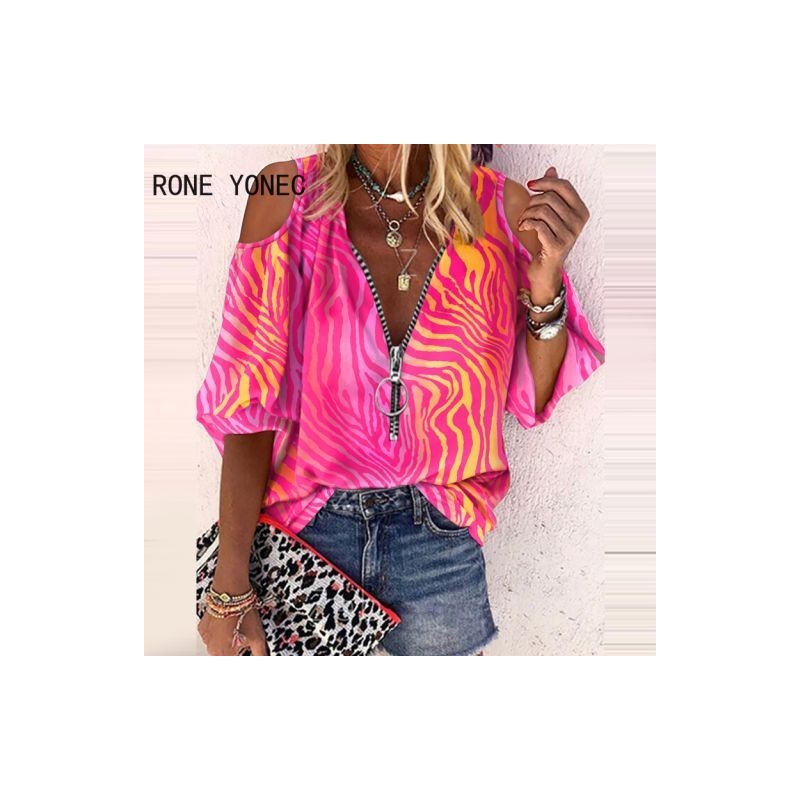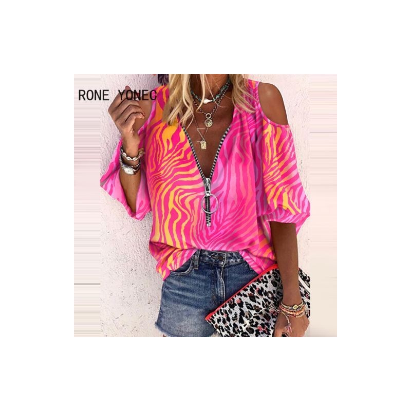 Női elegáns tigriscsíkos, cipzáras díszítés, vájt háromnegyedes ujjú, alkalmi blúz felsők