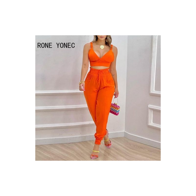 2023 Women Fashion Thick Straps Elastic Deep V Neck Crop Top & Hollow Out Pants Drawstring Sexy Pants Sets