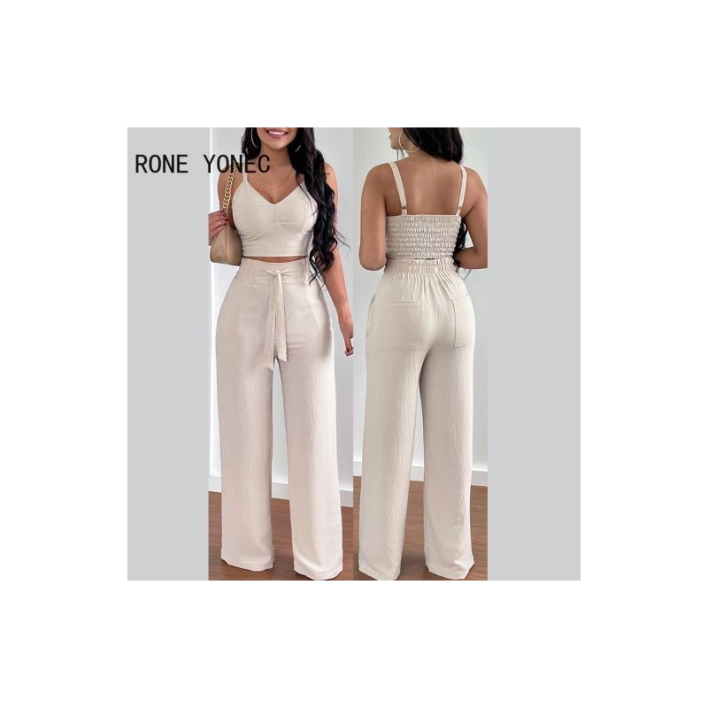 Women Fashion Chic Solid Sleeveless Lace Up V Neck Crop Top Pleated Long Straight Sexy Pants Sets