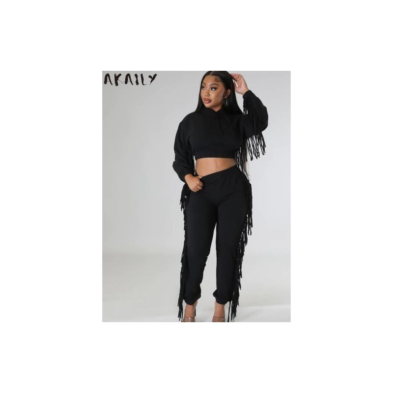 Akaily Fall Black Tassel 2 Two Piece Sets Women Outfits 2022 Long Sleeve Hoodies And Long Pants Sets Female Casual Matching Sets