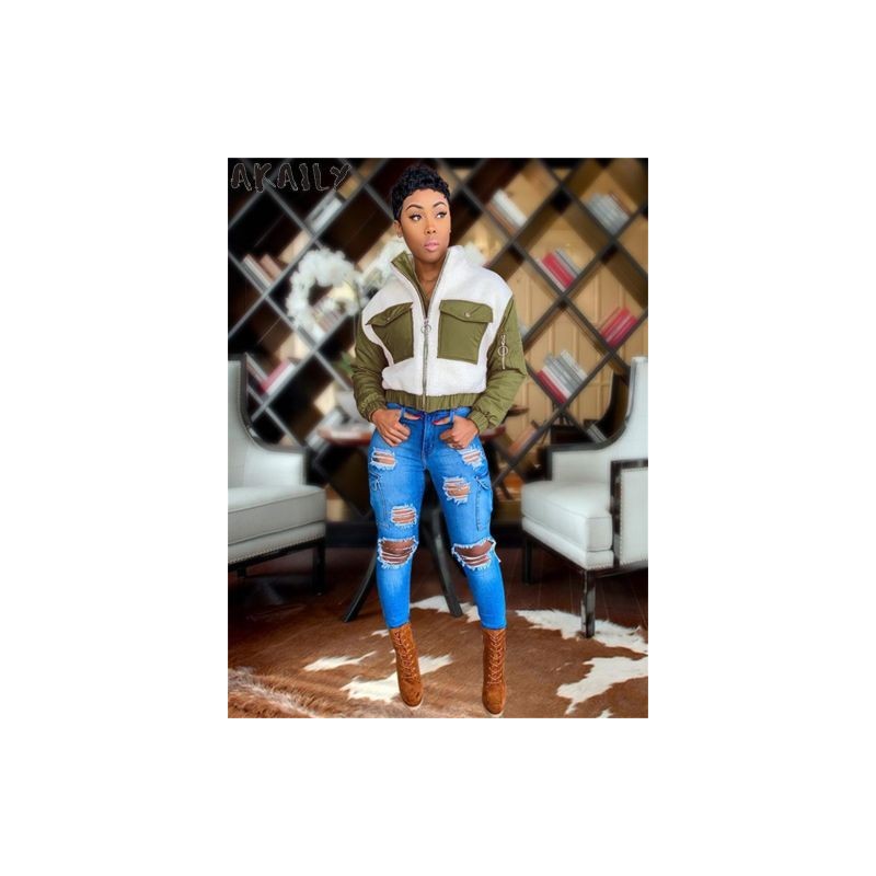Akaily Fall Winter Wool Zip Up Jackets For Women Fashion 2022 Patchwork Long Sleeve Winter Coat Female Casual Cargo Jackets