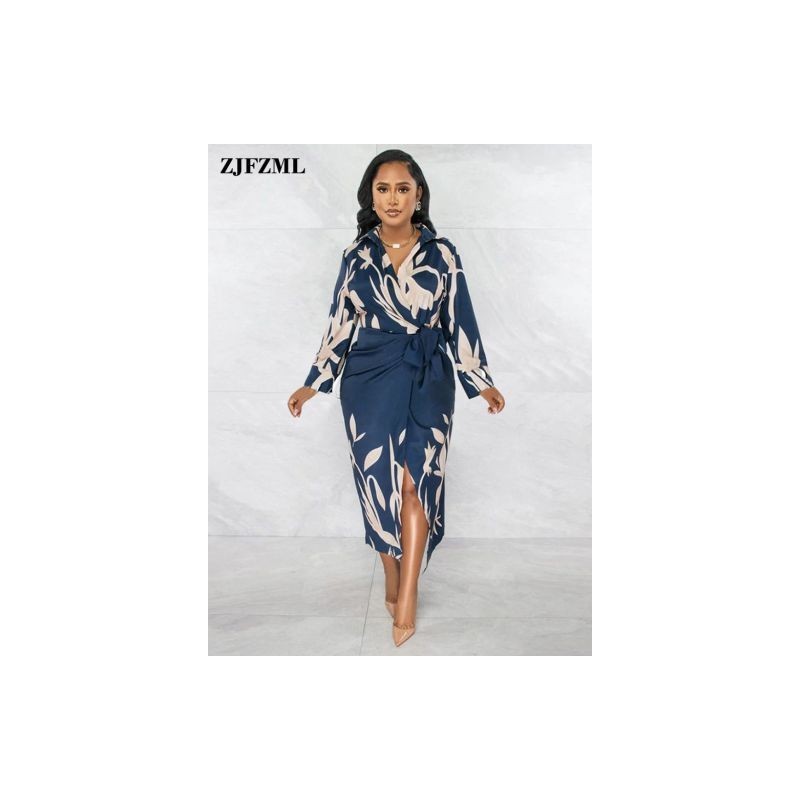 Geometric Pattern Elegant Women Shirt Dresses Chic Lapel Necked Long Sleeve Blouse Dress Classic Front High Split Bodycon Dress