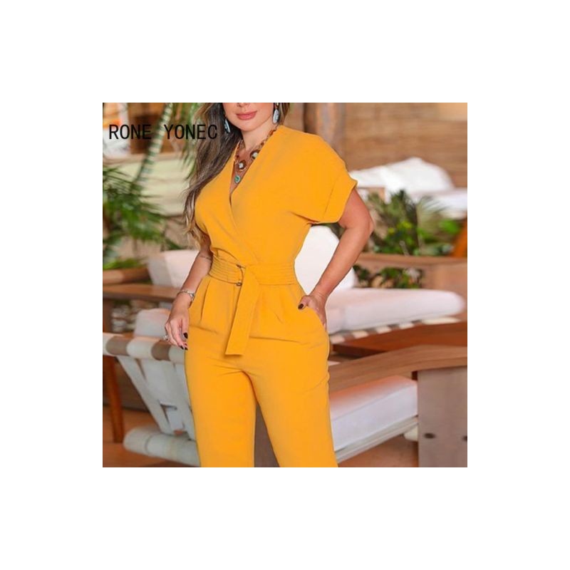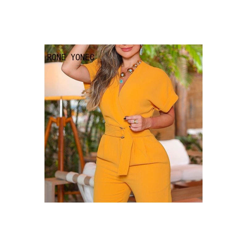 Women Casual Short Sleeves Solid Wrap V Neck with Belts Small Silt Lace Up Working Pants Set