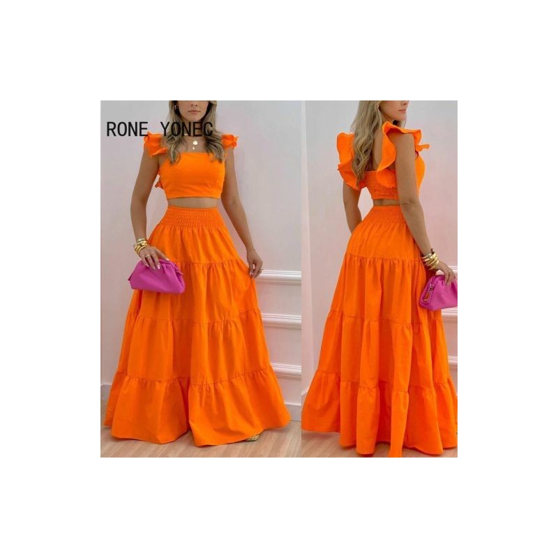 Női elegáns, tömör, repülő ujjú Crop Top maxi szoknya elasztikus derékrésben, többszintes szoknya szettek