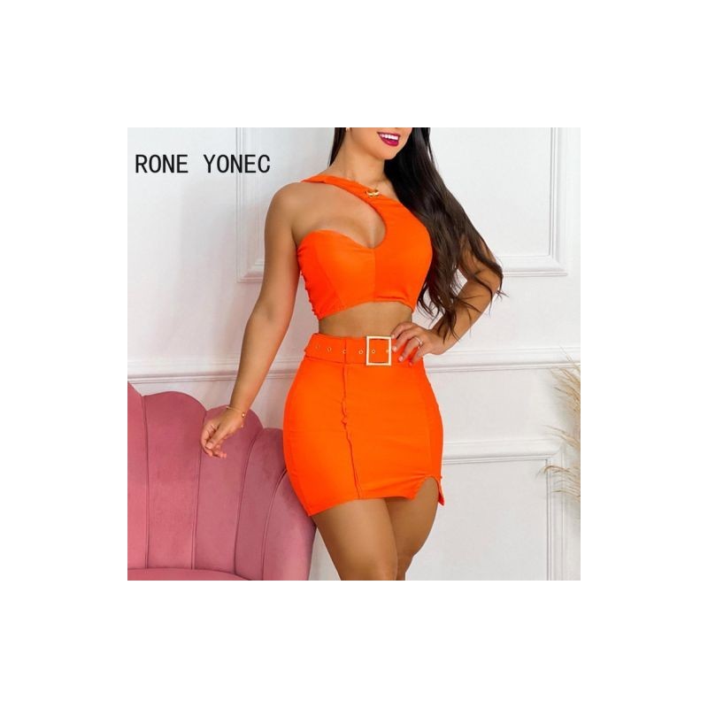 Women Chic Solid One Shoulder with Belts Crop Top Small Silt Bodycon Sexy Skirt Sets
