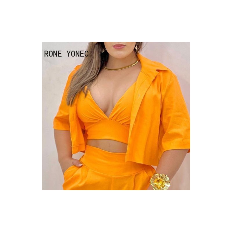 Women Sexy Half Long Sleeves Open Stitch Vneck Crop Top Inside Solid Three Pieces Sexy Short Sets