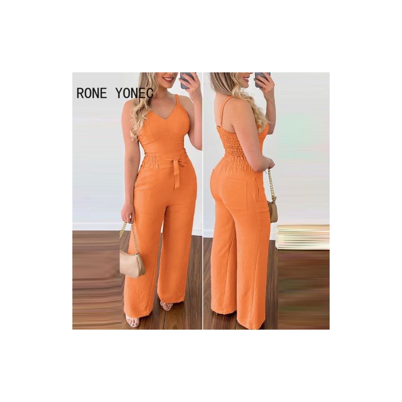 2023 Women Casual Thick Straps Lace Up Pleated High Elastic Waist with Pocket Straight Leg Pants Sets