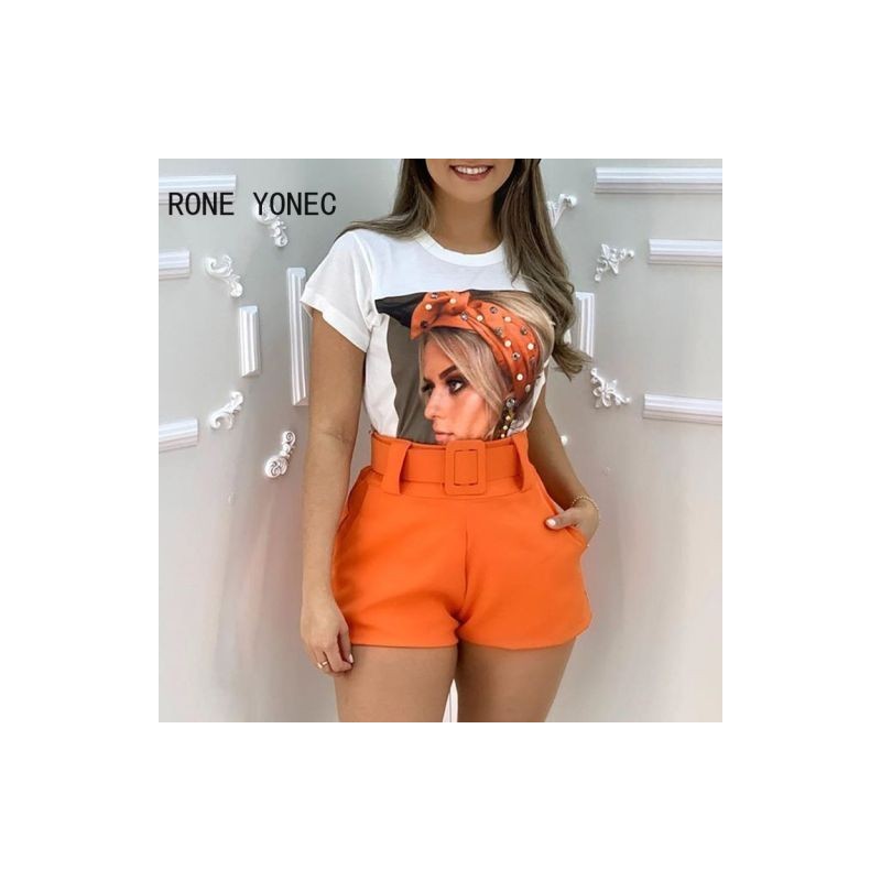 Női alkalmi sportos figuranyomtatás felső és tömör alsó kerek nyakú övvel, nyári rövid készletekkel