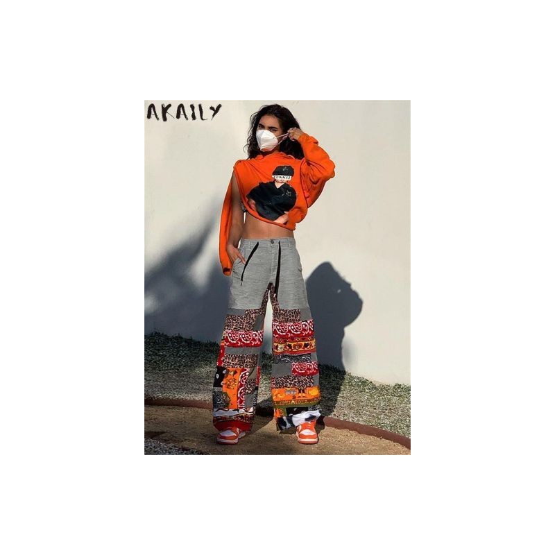 Akaily Fall Print Patchwork Baggy Pants Women Fashion 2022 High Waist Grai Wide Leg Flare Pants Ladies Straight Long Trousers