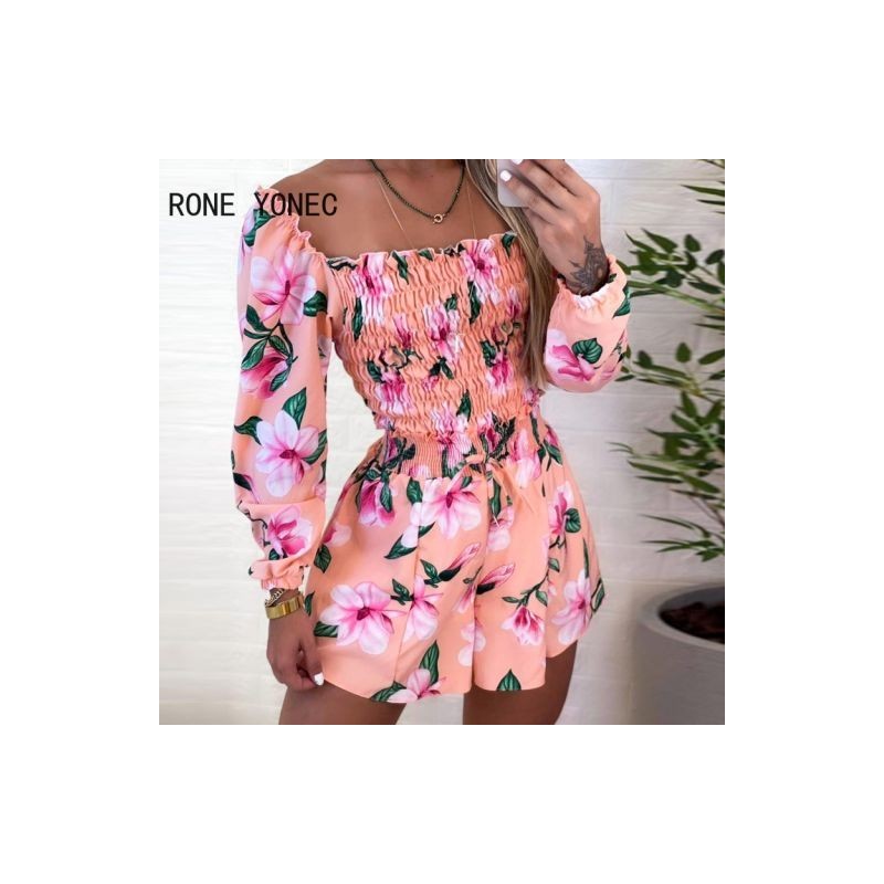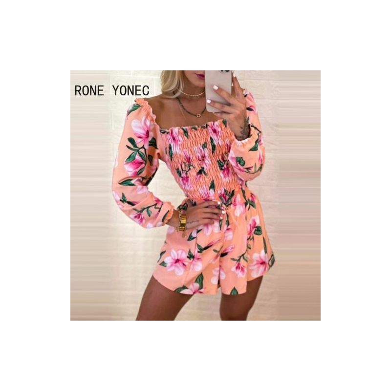 Women Casual Square Neck Puff Sleeve All Over Print Pleated Sweet Rompers