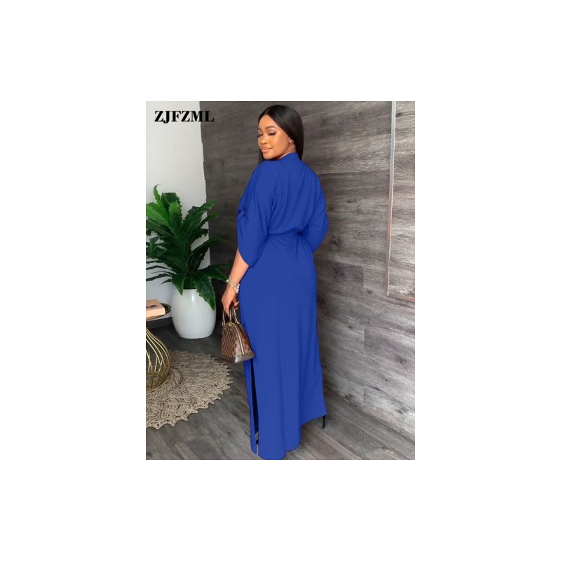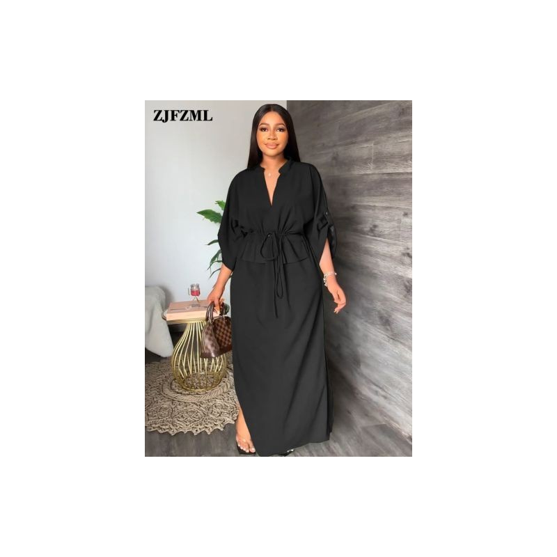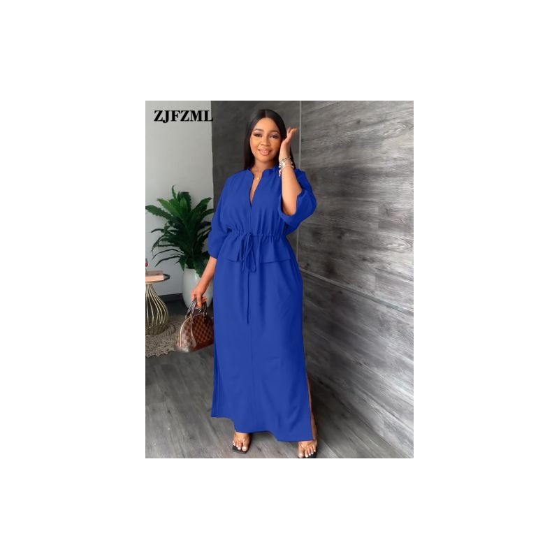 Office Lady Women Drawstring High Waist Dress Elegant Fashion Half Sleeve Double Side Split Straight Maxi Robe Black Orange Blue
