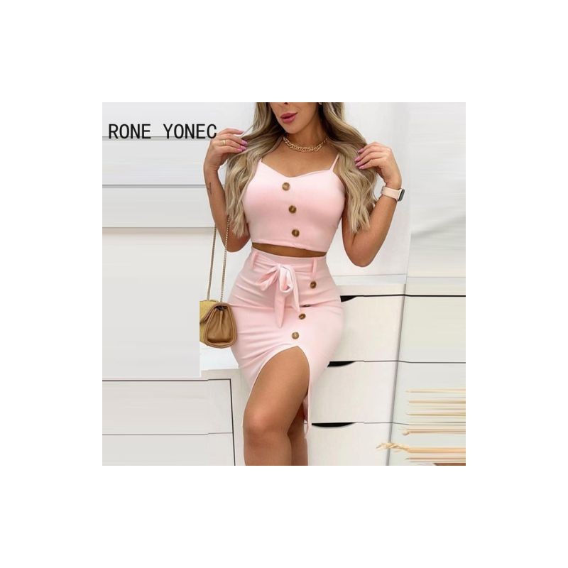 Női tömör spagetti pántos ujjatlan vágás felsők, húzózsinóros gombos magas iszapos midi szoknya szettek