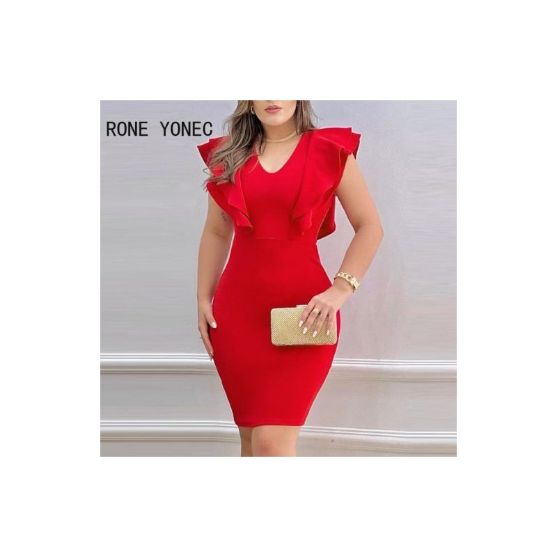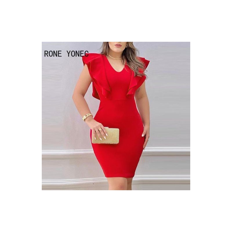 Női elegáns, tömör V-nyakú, többszintes Bodycon mini hivatalos party piros ruha