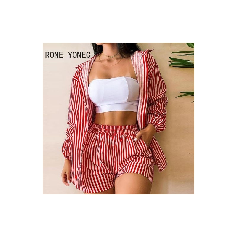Női ruha, 2023, csíkos mintás, hosszú ujjú ing és rövidnadrág szett, női kétrészes szettek hétköznapi viselet