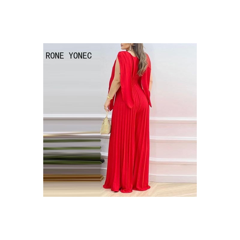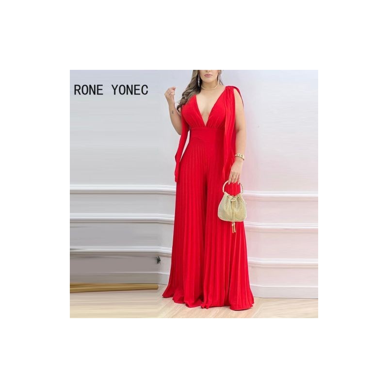 Women Elegant Solid Deep V Neck Sleeveless Pleated Three Dimensional Deocr Sexy Wide Leg Jumpsuit
