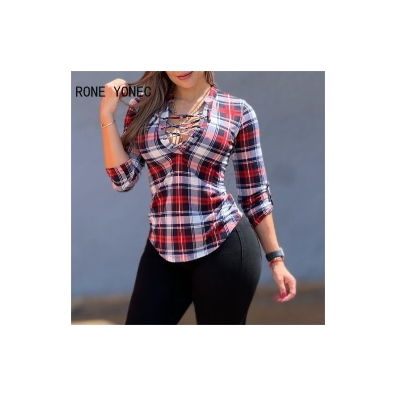 Női felsők 2023-as kockás, véletlenszerű mintás fűzős blúz Női blúz